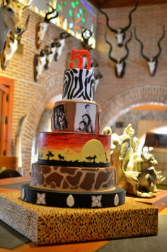 Tarta de 5 pisos tematizados con el estampado de diferentes pieles de animales cebra y jirafa, fotos impresas en papel de azucar y uno de los pisos pintado a mano con un atardecer africano. Esta tarta la hemos hecho para un evento en la que se celebrababan los 50 años de un aficionado a la caza y hacia una fiesta tematica Safari en un pabellon de caza en Toledo.