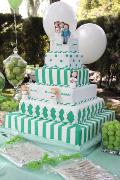 Esta tarta la hemos hecho para una comunión de 6 niños. Tiene 6 pisos de 12 cm de altura cada piso y las figuras de los niños modelados en fondant.