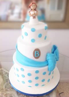Tarta de 3 pisos en tonos blanco y azules, combinando dos pisos de lunares con otra liso con gran lazada lateral. Y una figura modelada de la niña de Primera Comunión